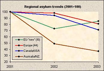 The number of asylum claims in industrialized countries fell by 22 percent in 2004, compounding a similarly steep decline last year. In the EU, the number fell by 19 percent, in North America by 26 percent and in Australia and New Zealand by 28 percent.