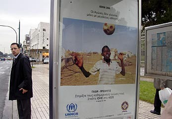ATHENS, Greece (UNHCR) - He seems an unlikely candidate for a poster boy during the Olympics - skinny, kicking a deflated football in a devastated Eritrean village. No bulging muscles, no product placement and no spanking new stadium to practise in.