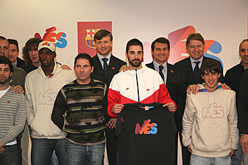 Members of Barcelona's basketball, football and hand ball teams at the launch with representatives of the three partner organizations.