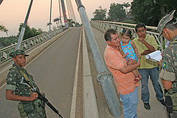The border post at Brasiléia in north-west Brazil. Several hundred Bolivians have fled political instability at home and sought shelter in this part of Brazil.