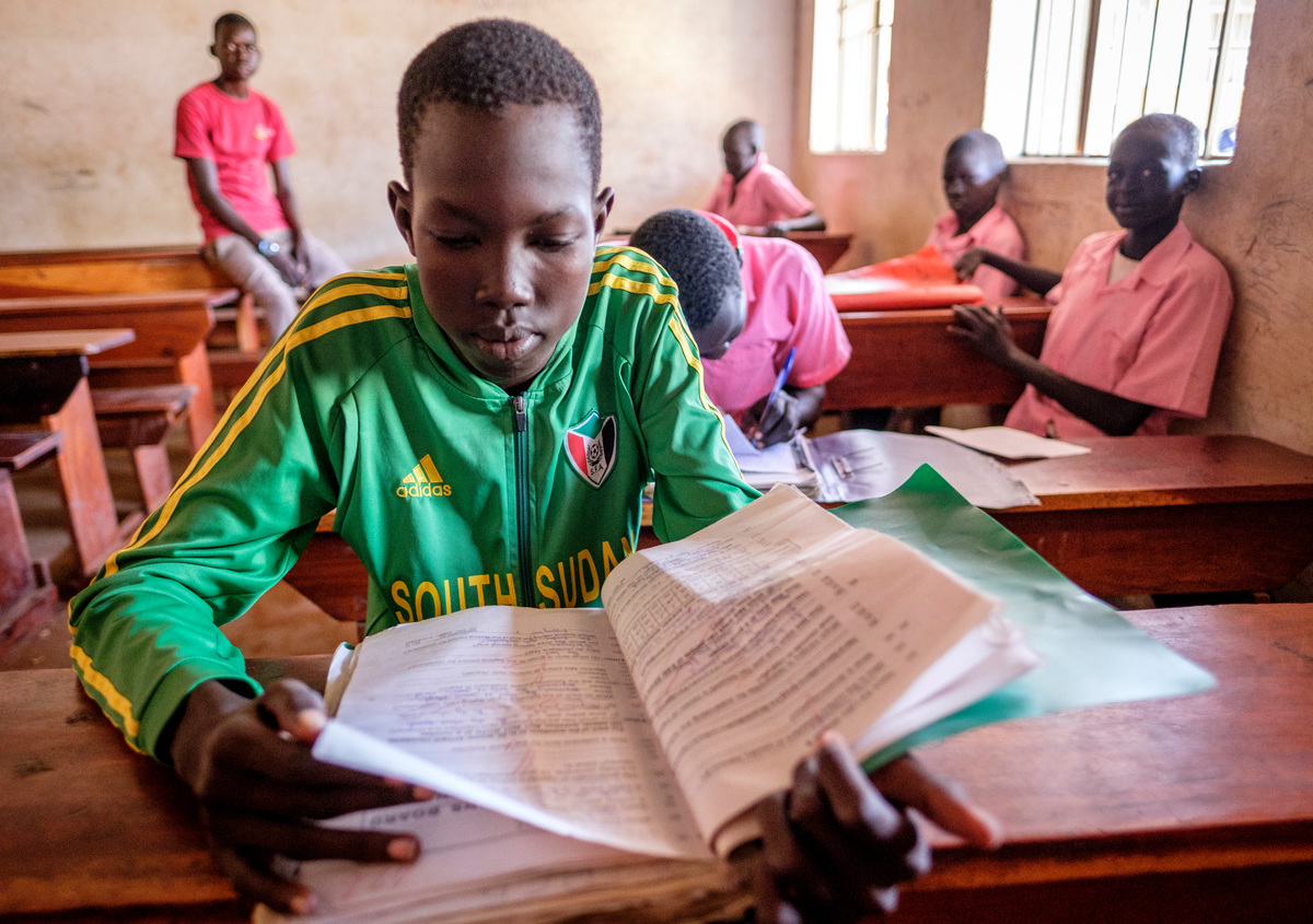 Aman Jok, 16, studies for exams at a primary school in Nymanzi refugee settlement in Adjumani district in Northern Uganda 3 May 2017. He fled insecurity in Bor, South Sudan, three years earlier.