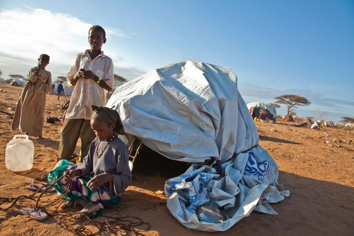 Fatuma Abdi Ali, a farmer from Dinsor Somalia weaves a cord to build her hut Dagahaley camp, Kenya as her son Jama Jalaf stands by.