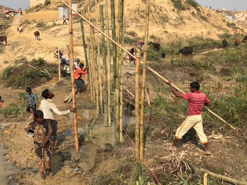 Small engineering projects continue in the settlements where UNHCR operates to build bamboo-reinforced footpaths and stairs, raised bridges, and retaining walls for soil stabilization and drainage networks. We are also pre-positioning 35 containers of post-storm relief items at distribution points across Kutupalong and Nayapara camps.