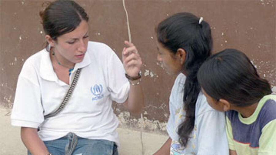 A UNHCR staff member interviews Colombians in the Ecuadorean town of Chical.