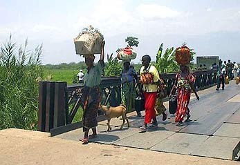 Congolese refugees fleeing to Burundi cross the bridge at Gatumba, October 2002.