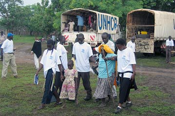Sudanese refugees are repatriated from Moyo in northern Uganda aboard UNHCR trucks. Earlier this week, the number of Sudanese returnees under a UNHCR programme launched last December passed the 10,000 mark.