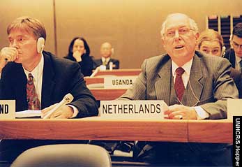Dutch Ambassador Hans J. Heinemann making a pledge on behalf of his government towards UNHCR's 2002 budget.