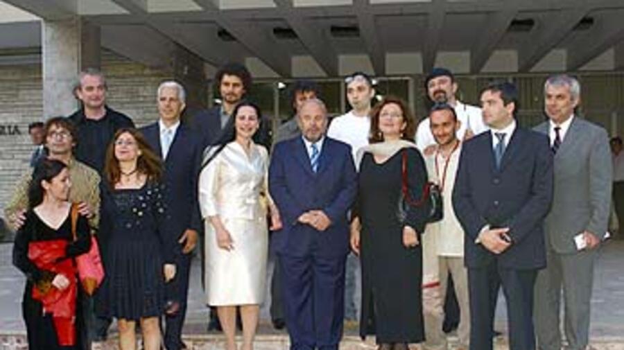 Albanian Prime Minister Fatos Nano (centre, with blue tie) with the returning artists at the National Gallery of Arts in Tirana.
