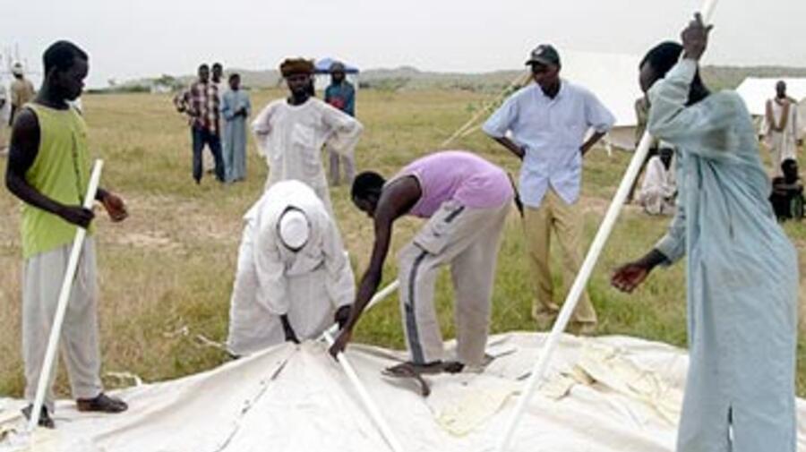 Workers setting up tents for new arrivals at Treguine camp in eastern Chad.