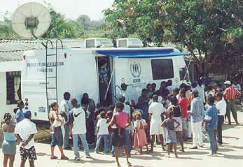 Carried out in conjunction with Colombia's National Registrar and departmental and municipal committees for displaced persons throughout the country, the project enables displaced people to obtain a cédula in just two months, compared to the usual six to eight months. The mobile unit, provided and equipped by UNHCR, carries out the necessary fingerprinting and collection of personal data and takes the photos to be used on the cards. The local health department often performs the required blood typing, but in some cases the refugee agency also takes care of this step of the process.