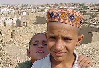 Two boys stand amid the remains of houses left behind in Camp-e-Jadeed, a teeming refugee settlement in Karachi.