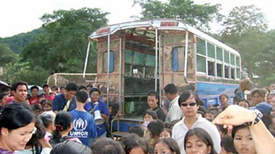 At Tham Hin refugee camp on the Thai-Myanmar border, the first Karen refugees to be resettled in the United States board a bus for the start of their journey to a new life.
