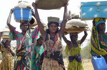 Displaced Chadian women walk near Goz Amer refugee camp after retrieving belongings from their village. High Commissioner António Guterres hopes to meet displaced Chadians.
