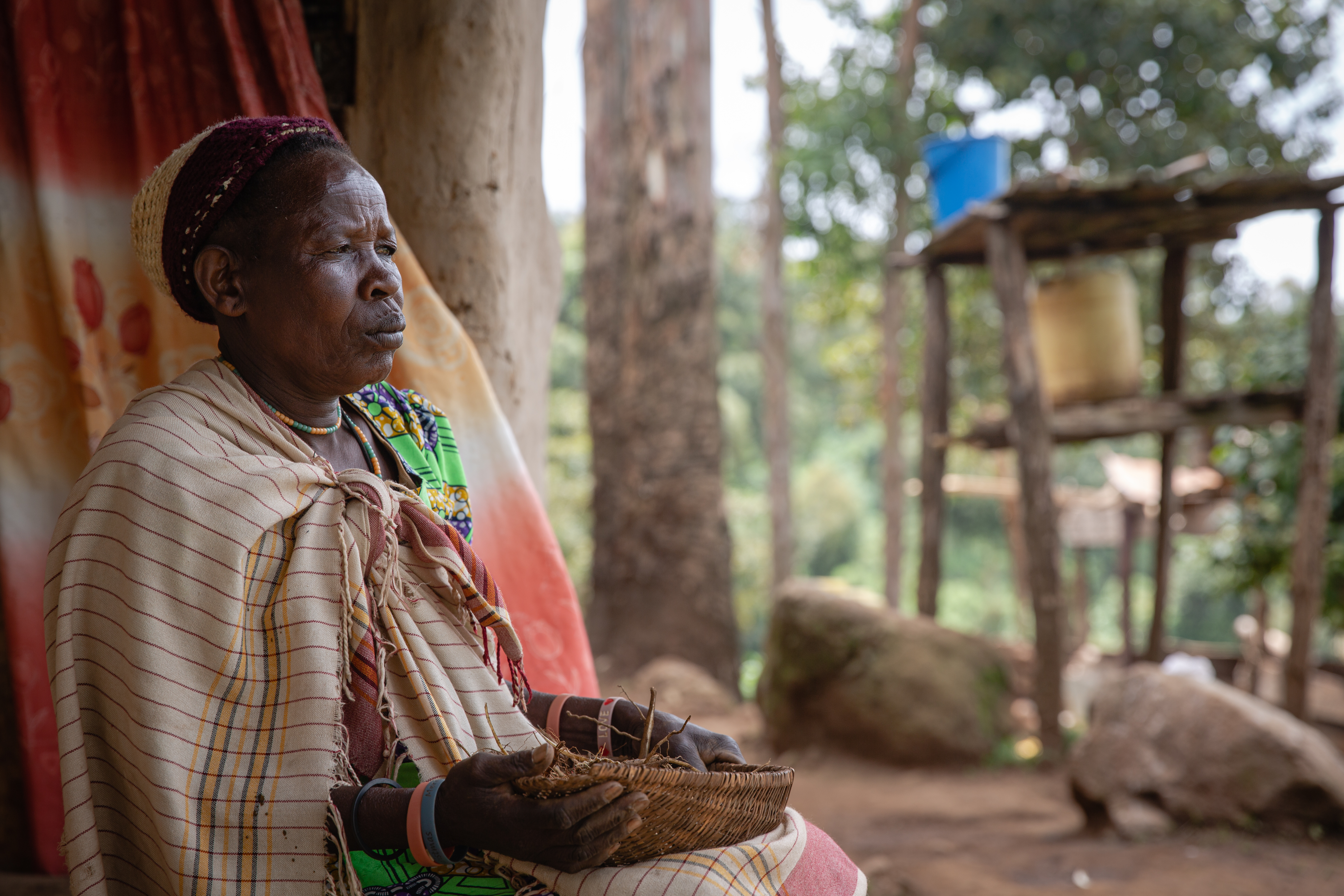 Moses Mwanga Kapchekwengu sits on an old rocking chair outside his home in the Mount Elgon region in Uganda. The 77-year-old was the first person in his village to attend primary school.