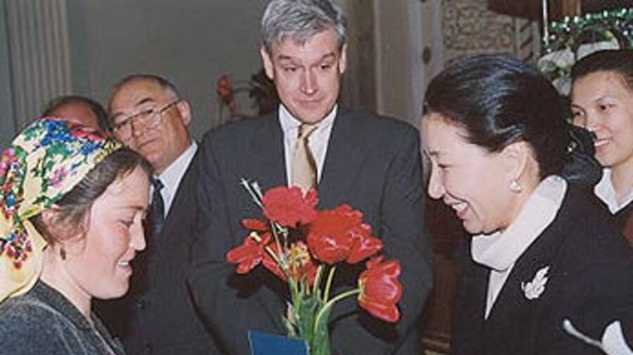Kyrgyzstan's First Lady, Professor Mairam Akaeva, handing out passports to Tajik refugees in a ceremony in April.