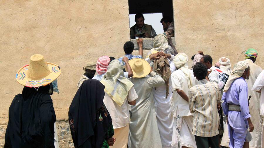 Displaced Yemeni civilians queue for an aid distribution in the north of the country.