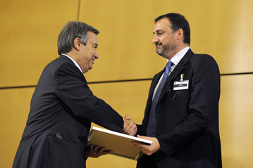 UN High Commissioner for Refugees António Guterres presents the Nansen Refugee Award to Chris Clark, programme manager of the UN Mine Action Coordination Centre South Lebanon.