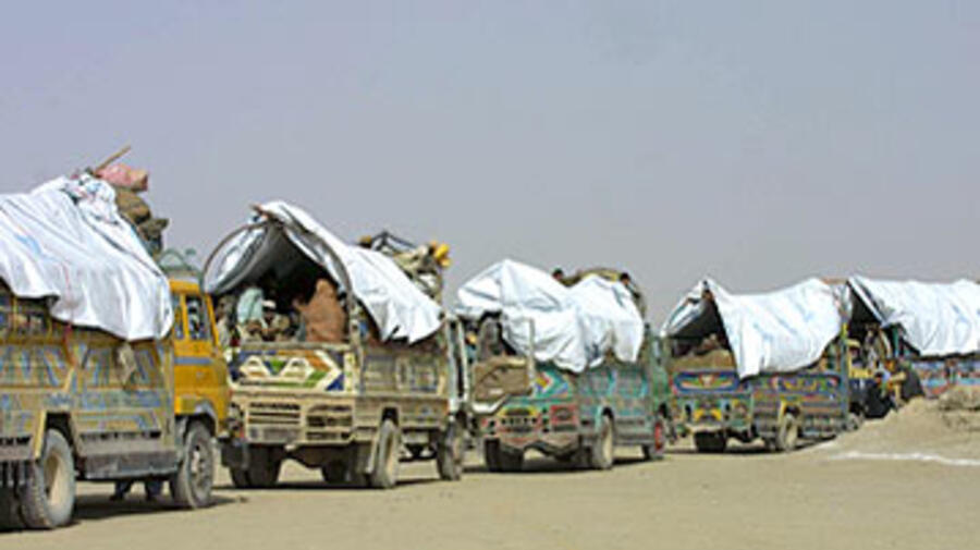 A convoy of Afghans leaves the Chaman waiting area.