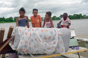 Displaced children with family belongings in the riverside town of Ríosucio in the northern Colombian department of Chocó.