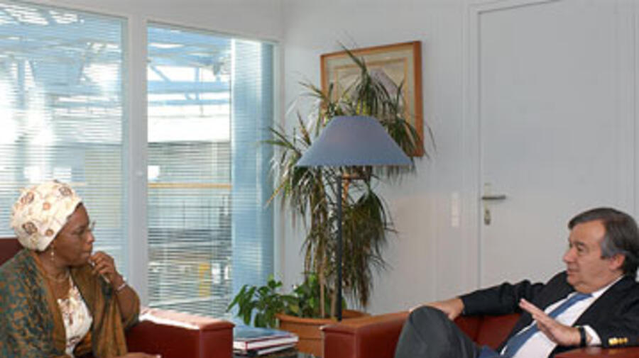 Nansen Refugee Award winner Marguerite Barankitse talking to UN High Commissioner for Refugees António Guterres. Earlier she had expressed dismay over the shortage of funds for Burundi.