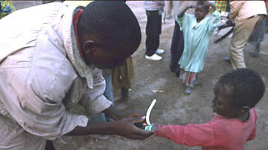 A young Angolan refugee being wrist-banded after registering for return from Divuma camp in the Democratic Republic of the Congo.