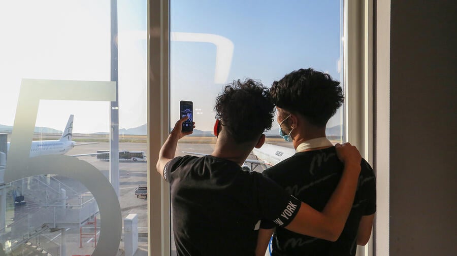 Two refugee children take a selfie at Athens airport ahead of their relocation flight to France.