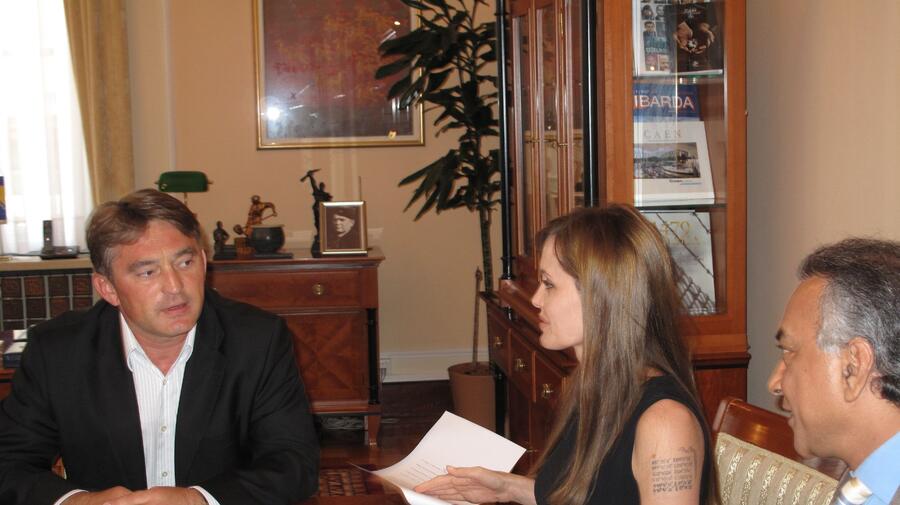 UNHCR Goodwill Ambassador Angelina Jolie meets with Bosnia and Herzegovina Presidency member Željko Komšić to discuss, among other issues, the plight of displaced people in the country.