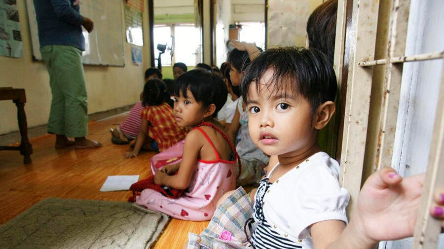 A Chin child peers out the doorway of the refugee-run school she attends in Malaysia, January 2009.