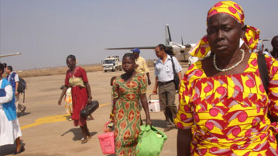 Sudanese refugees arrive in the town of Juba on a flight from Central African Republic.