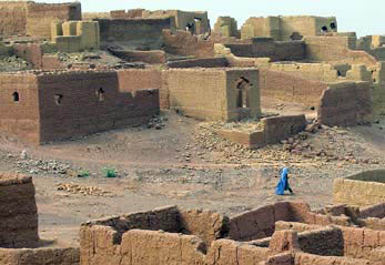 Large areas lie empty, the valuable timber from the roofs taken back to Afghanistan and the walls crumbling. The occasional refugee from still-occupied areas wanders through the ruins. A young boy watching over goats sings, his voice wafting hauntingly across the hills and gullies.