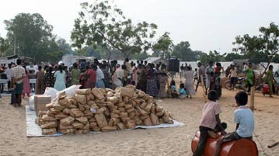 Internally displaced people wait for aid at a distribution point in eastern Sri Lanka. UNHCR is working with other groups to help some 5,000 people who have fled to Batticaloa district. Photo courtesy of and