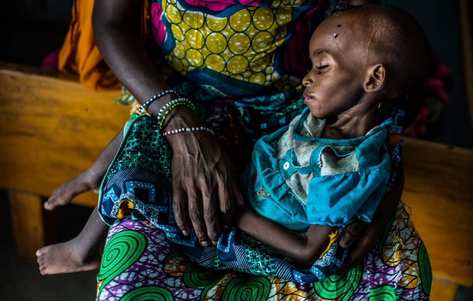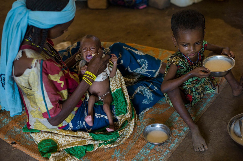 Habiba, 24, feeds porridge to young Ramatou, who was born deep in the forest as the fled Central African Republic. Both mother and child are struggling to survive. © UNHCR/Corentin Fohlen