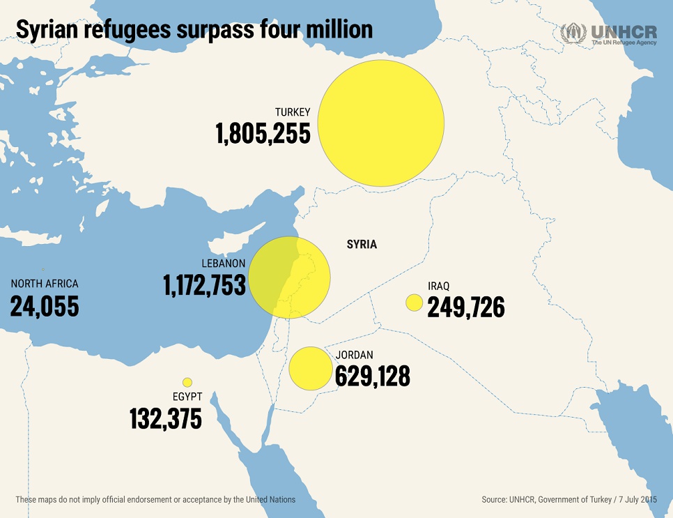 The 4 million figure is made up of 1,805,255 Syrian refugees in Turkey, 249,726 in Iraq, 629,128 in Jordan, 132,375 in Egypt, 1,172,753 in Lebanon, and 24,055 elsewhere in North Africa.