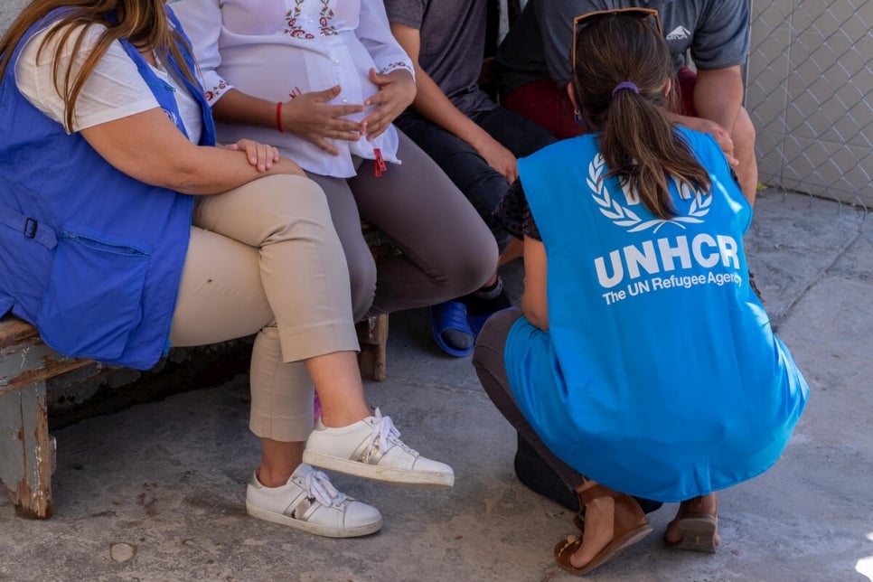 Two UNHCR staff members speak with asylum-seekers in a border town in northern Mexico.
