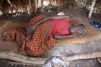 A displaced octogenarian woman writhes in pain in the town of Taduru, Haut-Uele district. She needs medicine.