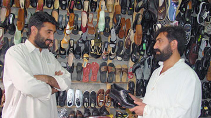 Recently registered Afghan Jabbar Khan (right) at work in his shoe shop in Muzaffarabad, Pakistan-administered Kashmir.