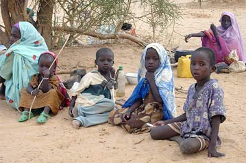 Refugees from the Darfur region of Sudan sit in the desert sand at the Oure-Cassoni camp in eastern Chad. UNHCR Goodwill Ambassador Angelina Jolie visited the camp earlier this week.