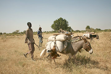 Driving their donkeys before them, two villagers flee towards the security of a site for displaced people in Habile, near Koukou.