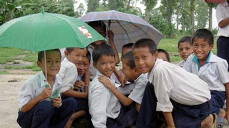 Bhutanese refugee school boys shelter from the monsoon rains in Khudunabari camp in Jhapa district, eastern Nepal. Most of them were born in exile and have never seen Bhutan.
