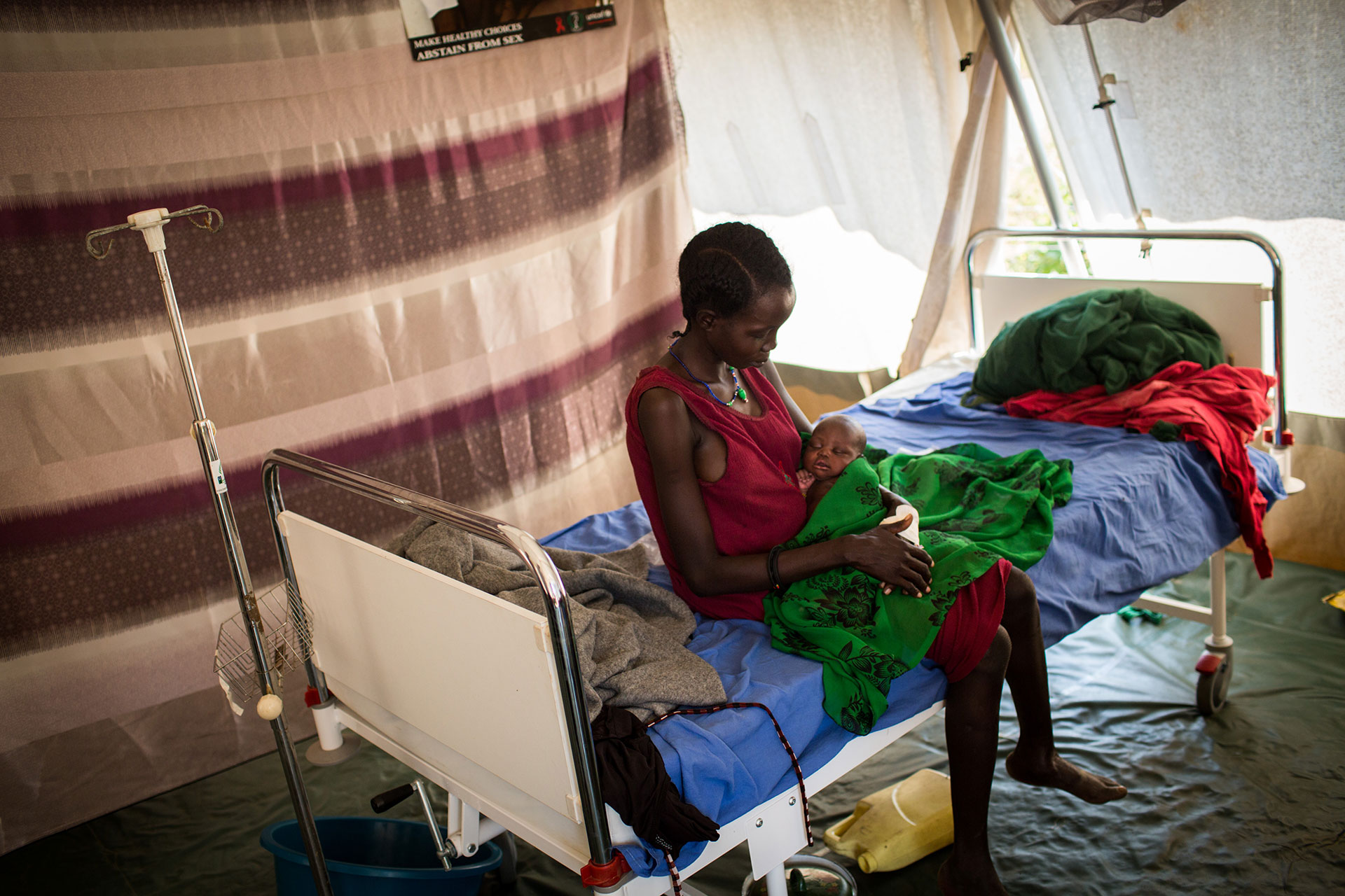 Nyandir Awan cradles her two-week-old daughter, Adol, at a paediatric ward in Mingkaman, South Sudan. Previously, she lost two children within days of giving birth.