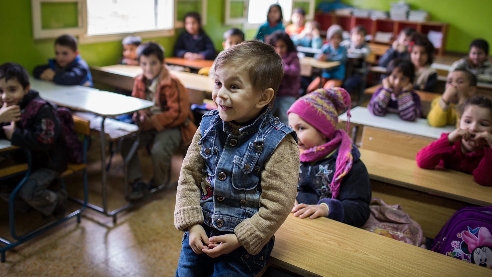 Omar attends a "second shift" class in northern Lebanon. He says, "I like school a lot because they teach me French."