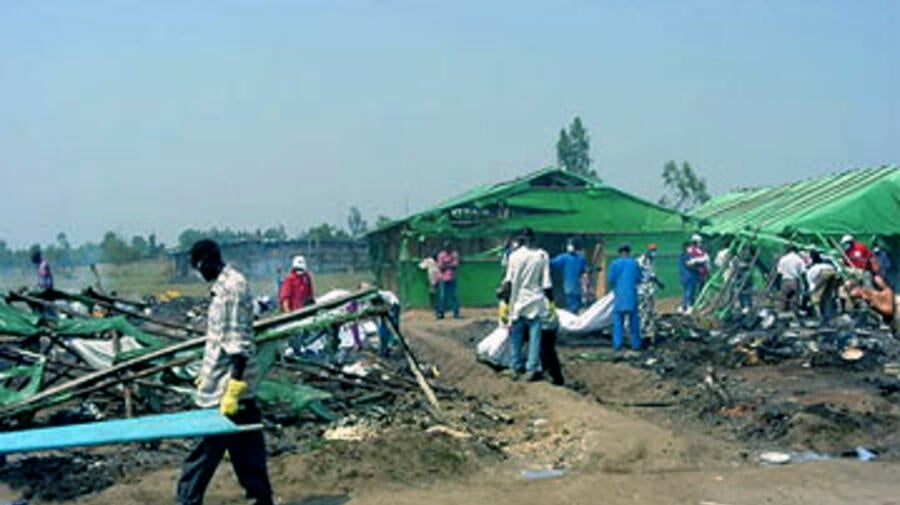 UNHCR staff and other rescuers who rushed to the scene of the carnage at daybreak found traumatized survivors wailing and weeping in each other's arms. The stench of death and smoke from the torched hangars still enveloped the camp that had been temporary home to some 860 refugees who had fled recent violence in the DRC.