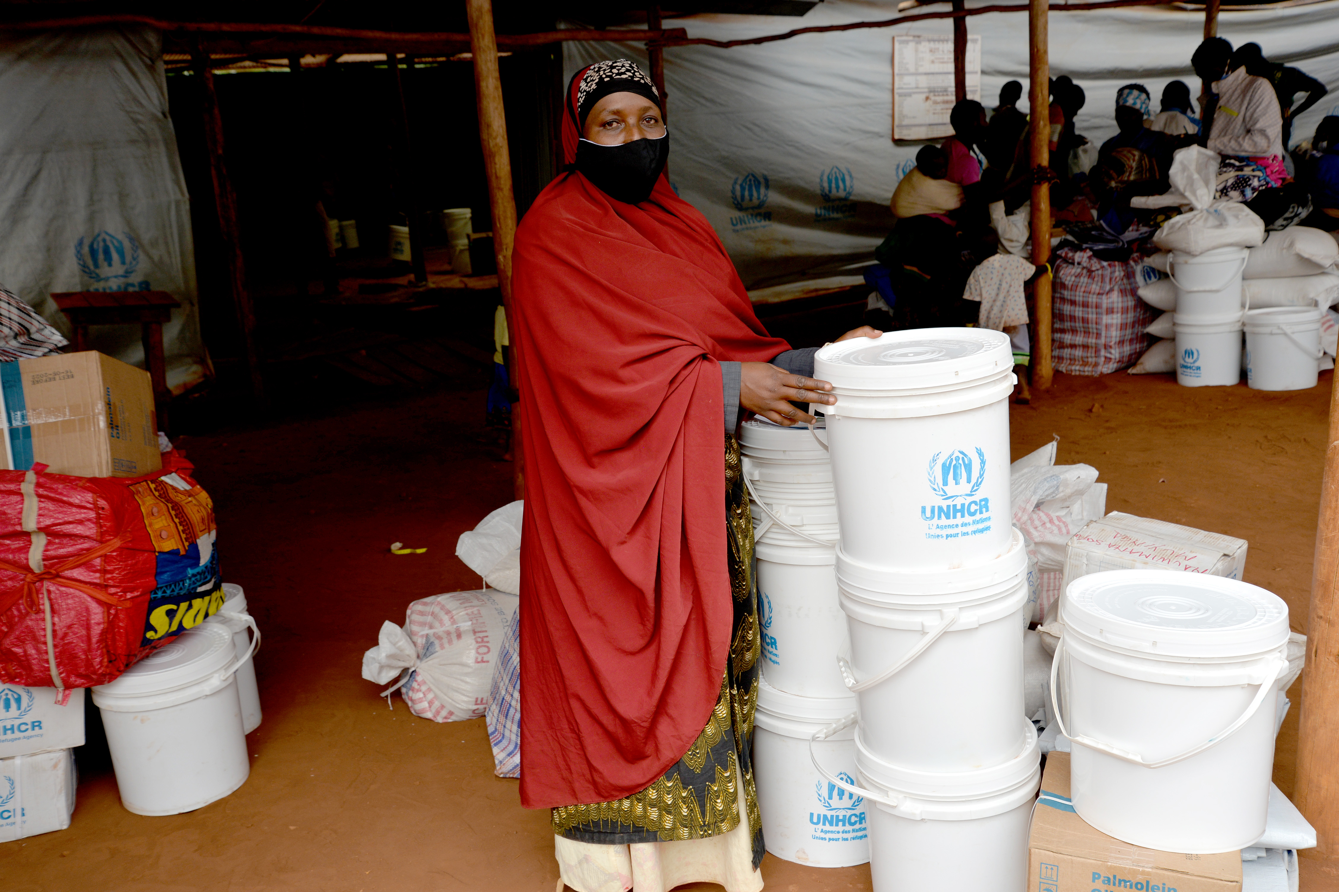 Burundian returnee, Safia Nduwimana receives non-food items at a distribution hangar in Burundi.