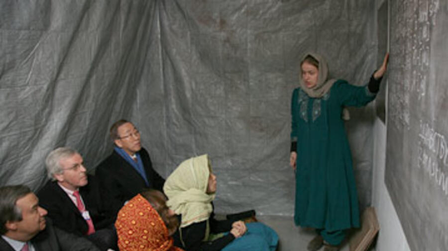VIP Tour: A simulated refugee camp classroom with some high-profile "students" in the back row. From left to right: High Commissioner Guterres, UN humanitarian chief Sir John Holmes, and UN Secretary-General Ban Ki-moon.