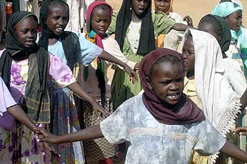 Sudanese schoolchildren dance in a circle in the yard of Iridimi camp in eastern Chad.