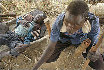 Armed with a bow and arrows, a villagers keeps watch over his wounded friend in the village of Djorlo.