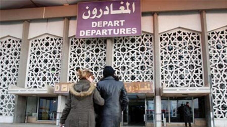 Accompanied by a UNHCR protection officer, Hiba (right) walks into the Damascus airport for her flight to Canada.