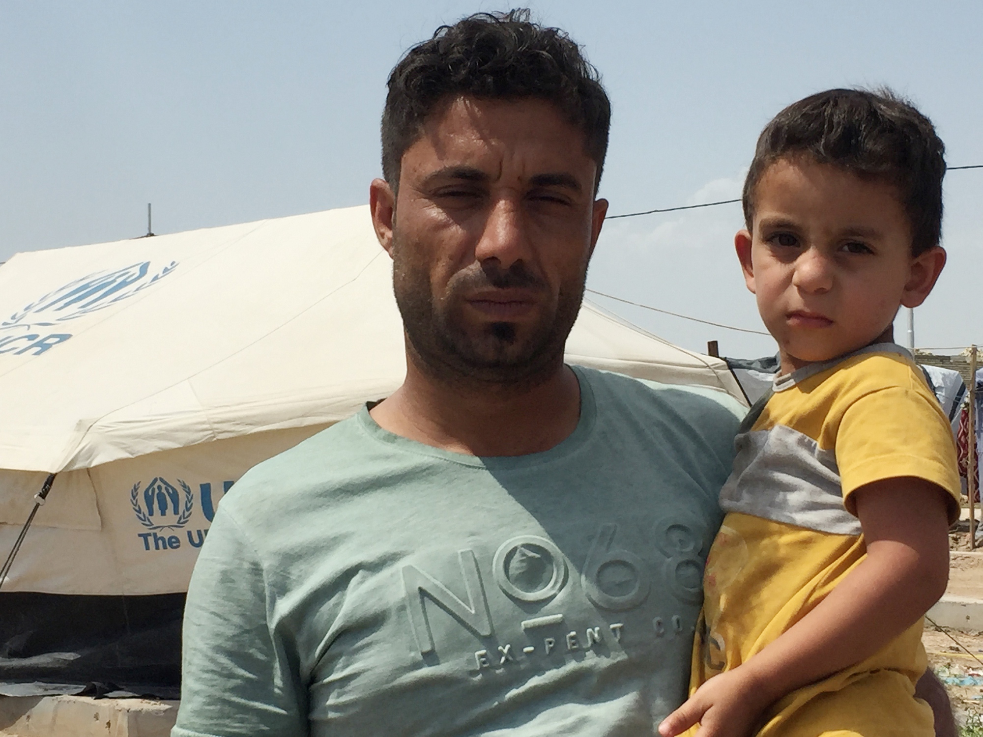Khairallah Farhan holds a child at Al Salam camp for displaced families, Baghdad, Iraq.