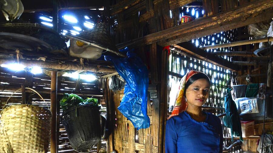 A displaced woman stands in a temporary longhouse shelter in Minbya township, Rakhine State, Myanmar.