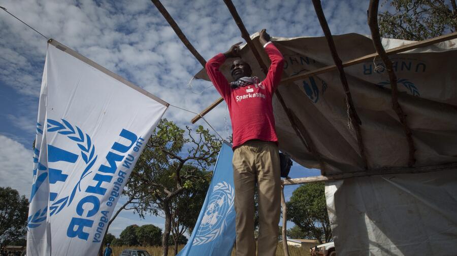A refugee helps put up a UNHCR tent in the Cameroon. Sub-Saharan Africa remains the largest recipient of UNHCR assistance.